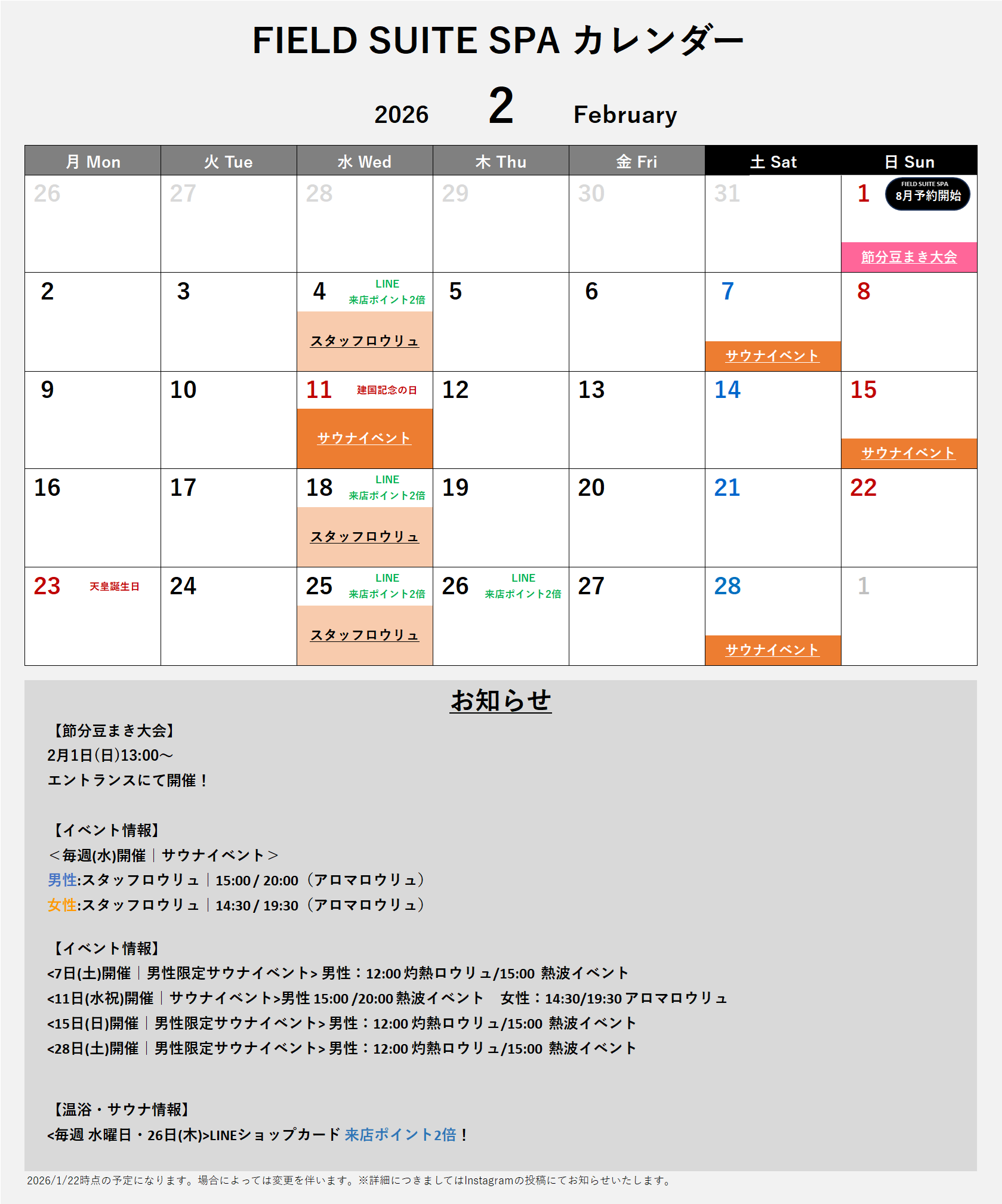FIELD SUITE SPAの2月開催イベントをご案内させていただきます。