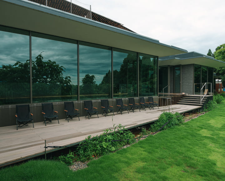 粟ヶ岳を望む外気浴スペースは、下田郷の自然を身近に感じていただけます。スノーピークのチェアに火照った体をゆだね、時を忘れるほどにお寛ぎください。