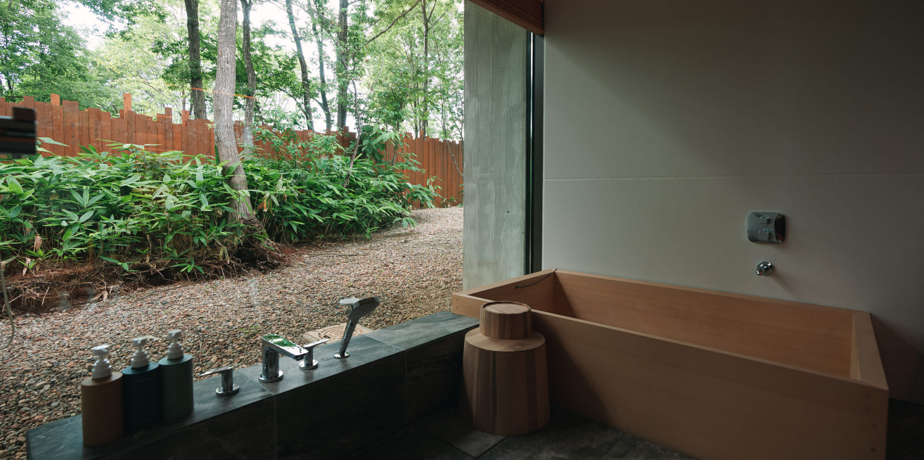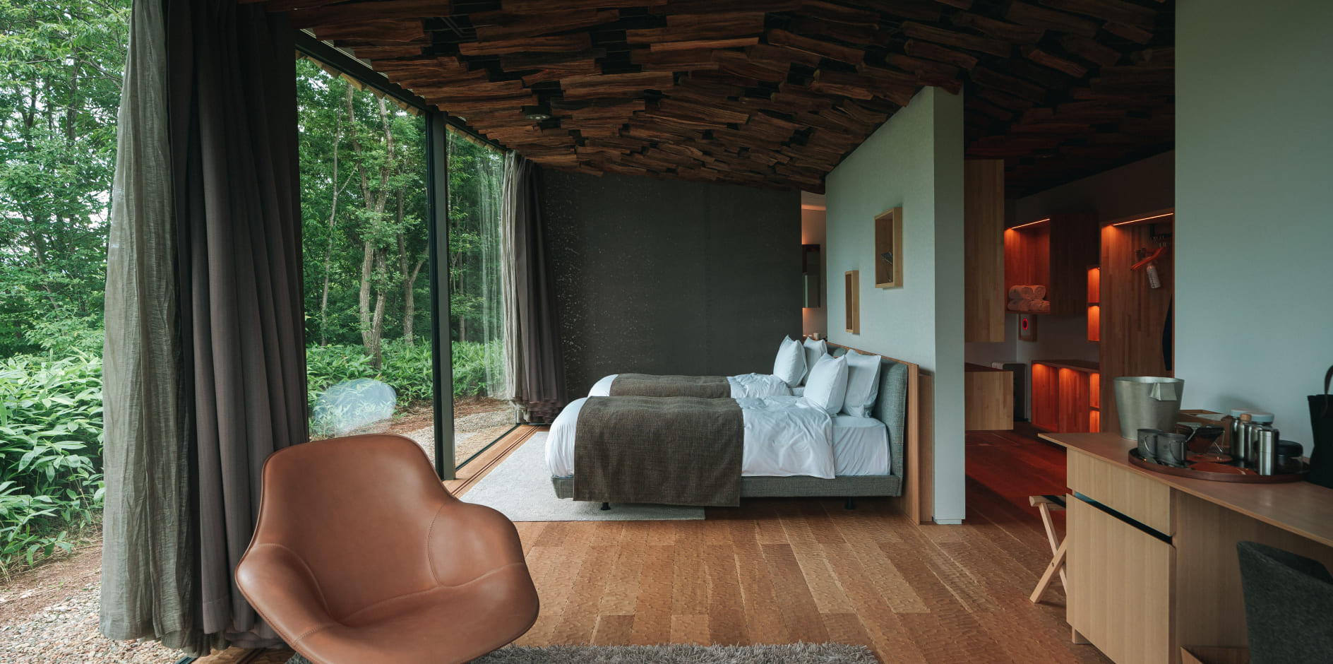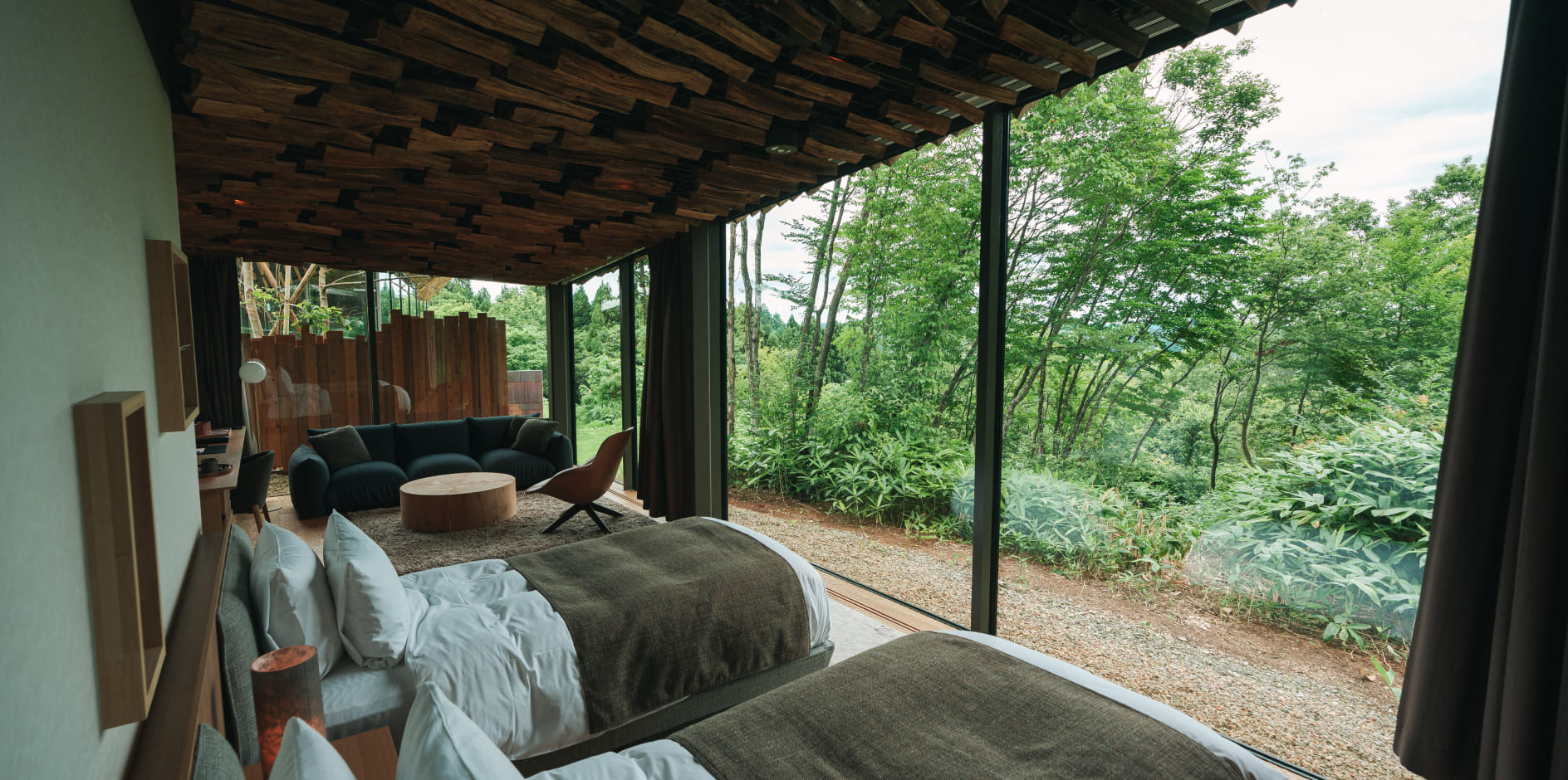 四方を広大なガラス窓で囲まれた室内からは、まるで自然の中で過ごすかのように、四季の自然と時間の移ろいを体験いただけます。天井に施された薪は、内と外の境界が曖昧な非日常を演出。キッチン完備のため、長期滞在やお料理を楽しみたい方にもおすすめです。ヴィラ棟の外には広いデッキスペースと専用でお使いいただける外風呂をご用意。自由にお過ごしいただけます。
