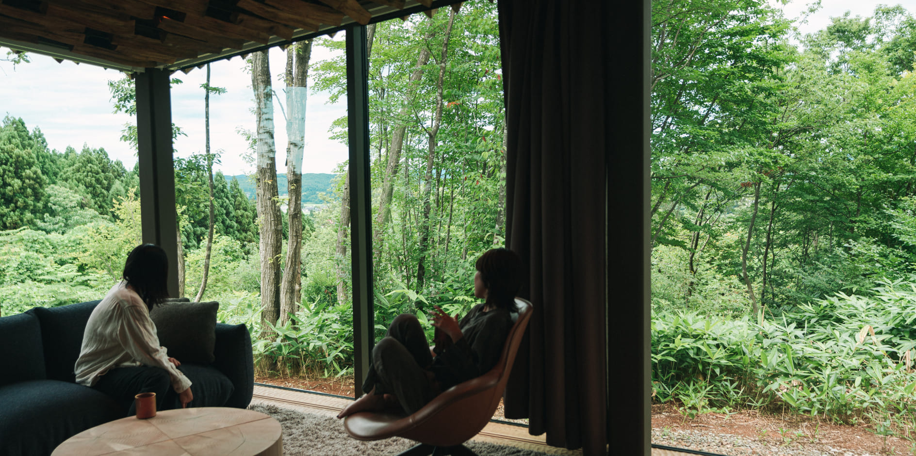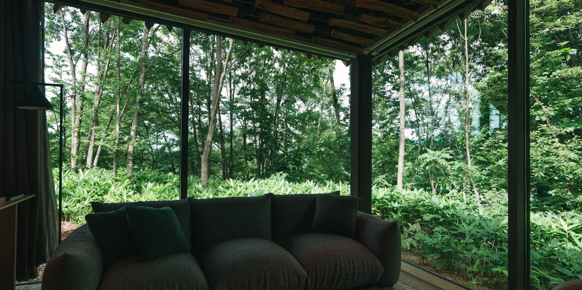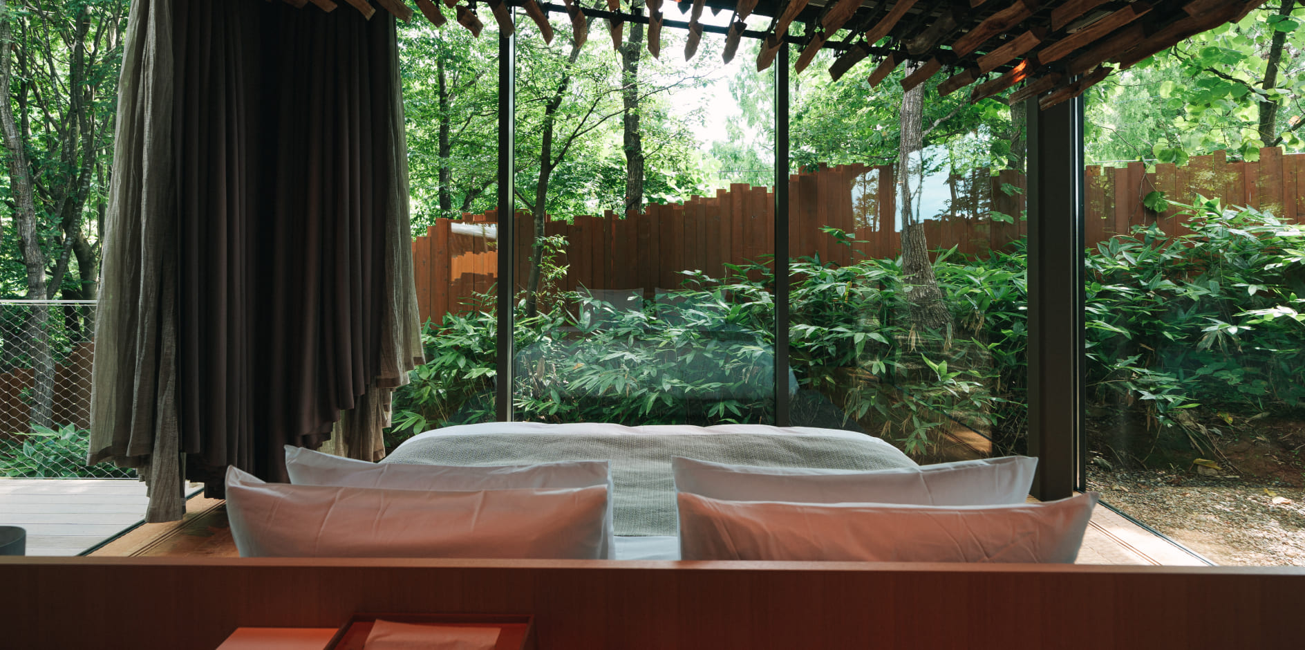 四方を広大なガラス窓で囲まれた室内からは、まるで自然の中で過ごすかのように、四季の自然と時間の移ろいを体験いただけます。天井に施された薪は、内と外の境界が曖昧な非日常を演出。キッチン完備のため、長期滞在やお料理を楽しみたい方にもおすすめです。ヴィラ棟の外には広いデッキスペースと専用でお使いいただける外風呂をご用意。自由にお過ごしいただけます。