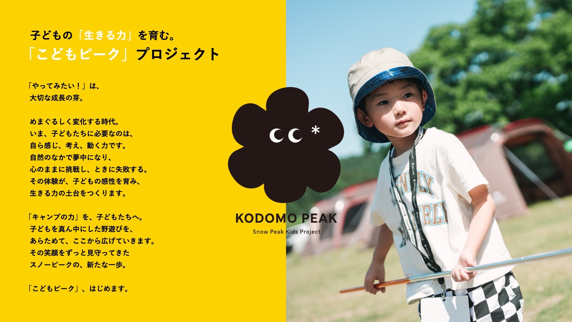 スノーピークは「キャンプの力」を信じています。自然の中、親子協力してテントを張り、工夫して食事をつくり、夜を過ごす。自然に包まれて過ごすことは、「人間力」「生きる力」を育むことにつながります。情報に溢れ、AIの台頭など、高度化する現代において、デジタルが世界を席巻すればするほど、キャンプや自然体験などリアルな体験へのニーズはますます高まっています。これからを担う子どもたちが、自然とともに人間らしく強く生きていく―― 。遥か昔から豊かな自然の中で野遊びを楽しんできた日本生まれのスノーピークだからこそできるやり方で、私たちはその力を育む機会提供を「こどもピーク」の考えのもと行ってまいります。そして、子どもだけではなく子どもの成長を支える親御さんにとっても、親子での自然体験を通じて「人間性の回復と解放」につながるプロジェクトとなることを目指しています。
