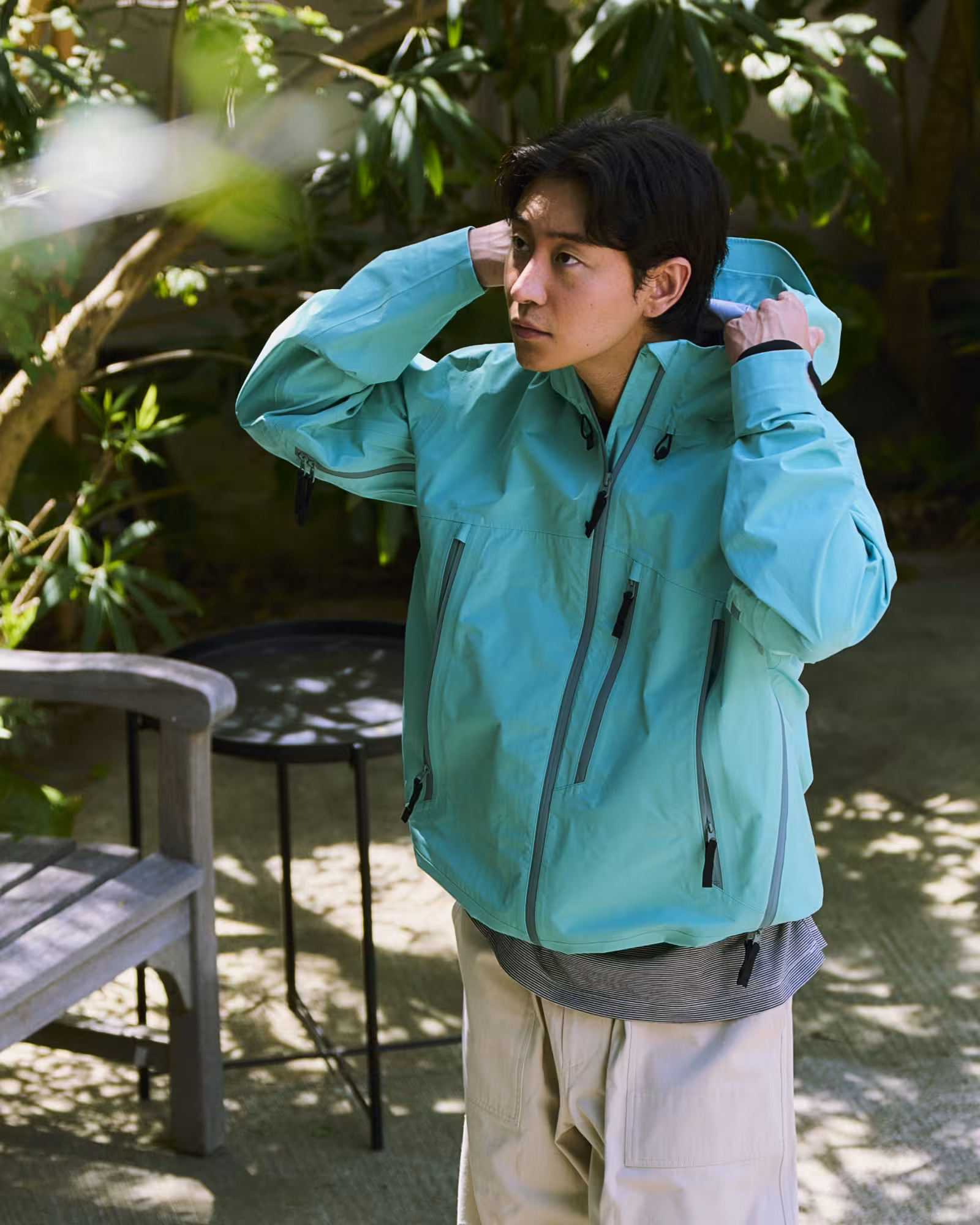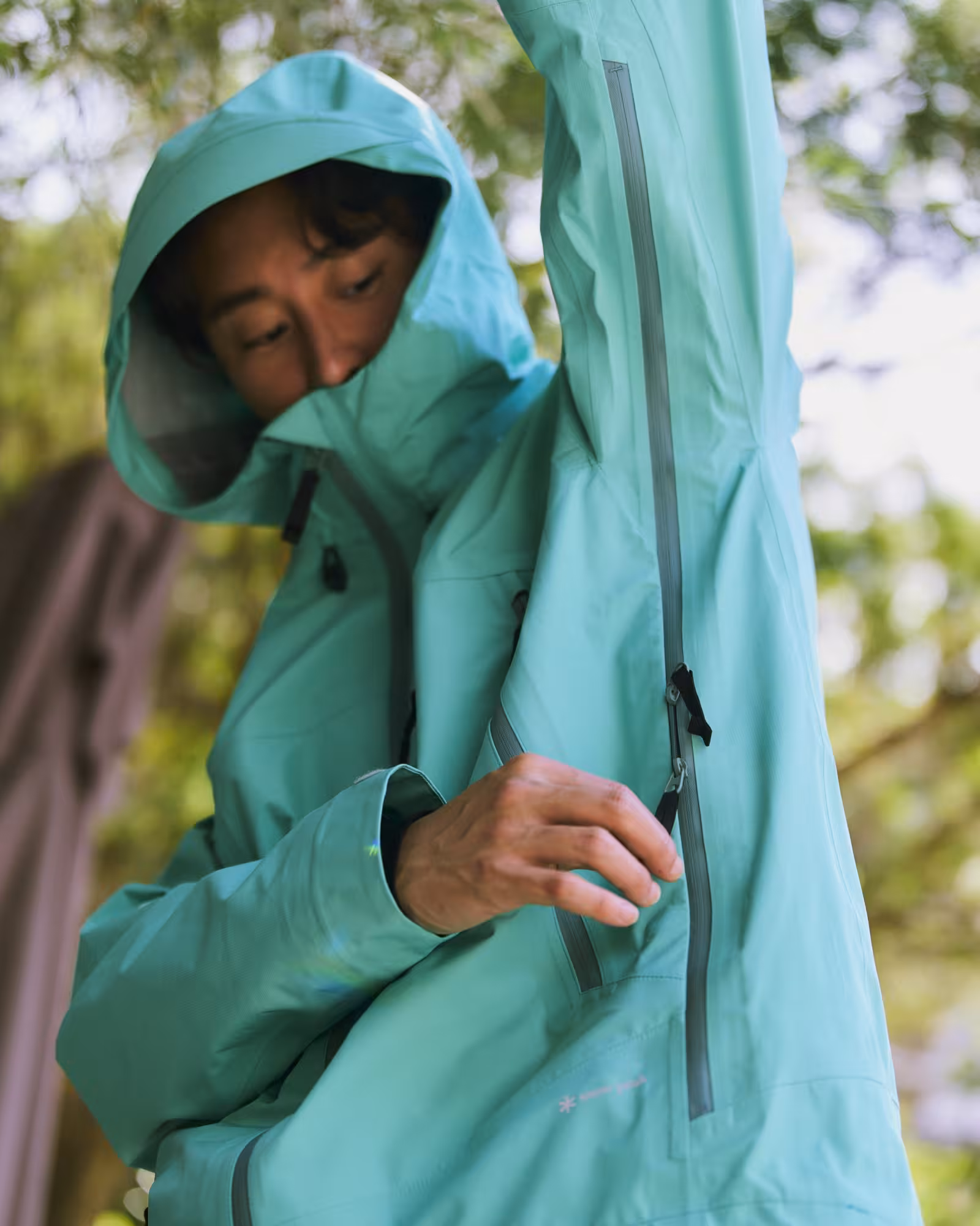 フードは内蔵型アジャスターと後頭部の調整機能を備え、フィット感を高めながら視界も確保。袖下には止水ベンチレーションを配置し、雨を防ぎつつ衣類内の換気が可能です。立体的な二枚袖構造や裾・袖口の調整機能により、動きやすさと快適性を両立しました。