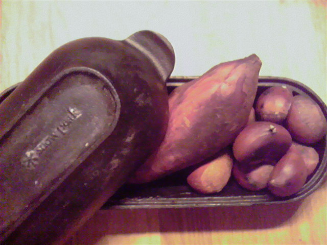 焼き栗・芋は今日のおやつに妻が作ったものです、栗が爆ぜてコロダッチの蓋が飛んだのにはビックリ(クリだけに)しました。