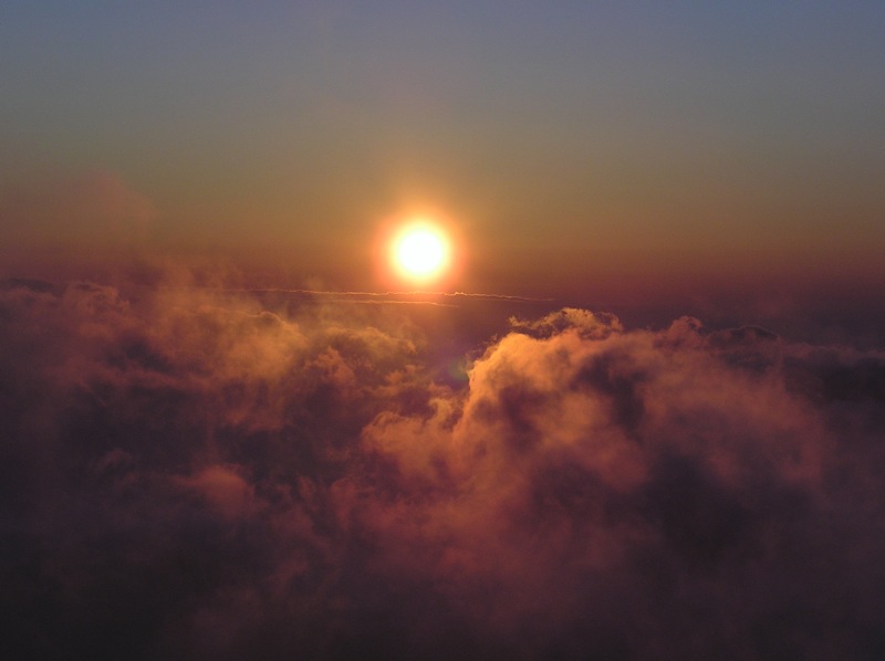 苗場山頂の日没時の光景です。眼下の雲が東風で苗場山の斜面に沿って上昇しはじめるなか、陽が沈んでいきました。